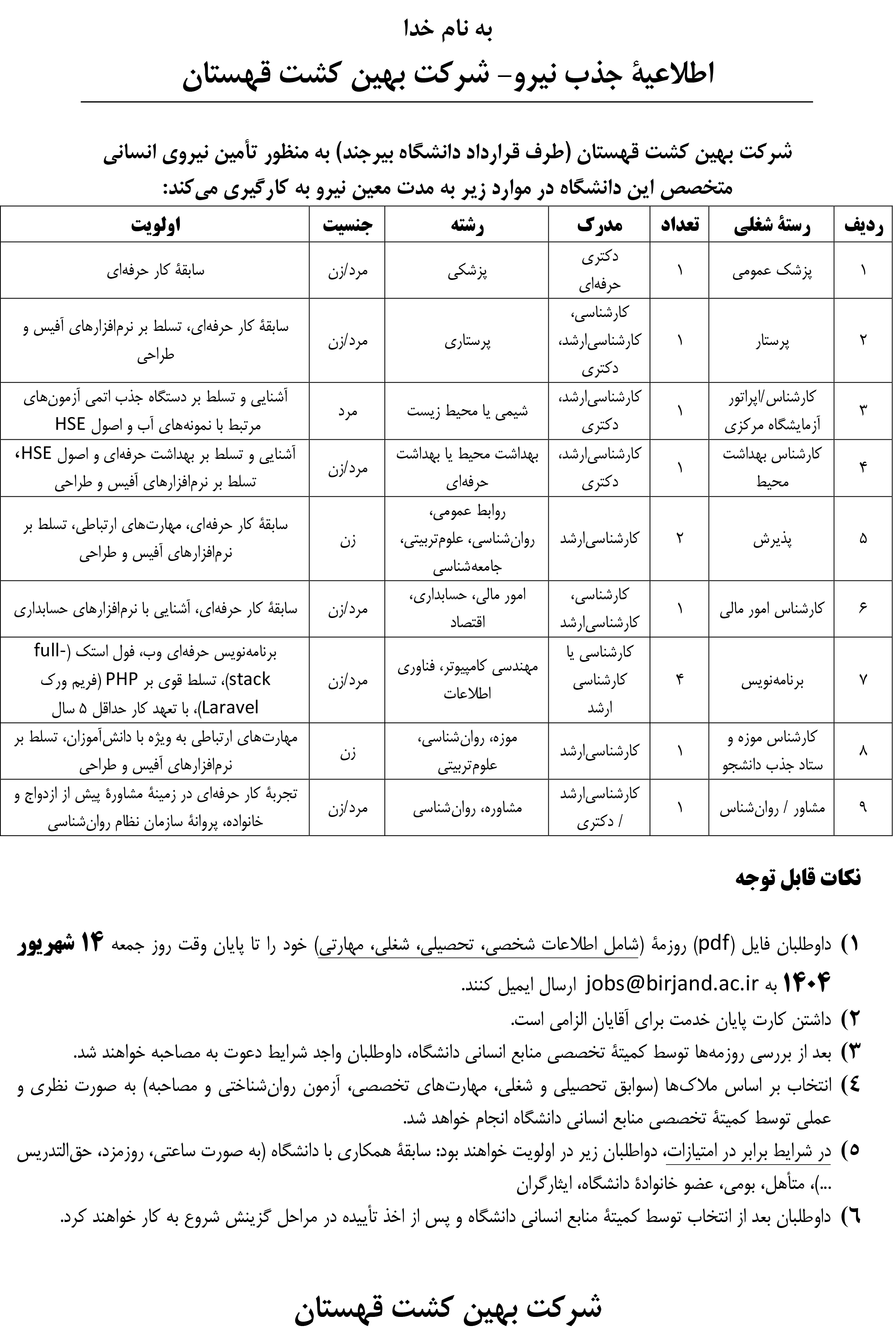 شرکت بهین کشت قهستان(طرف قرارداد دانشگاه بیرجند) به منظور تأمین نیروی انسانی متخصص این دانشگاه در موارد زیر به مدت معین نیرو به کارگیری می‌کند؛