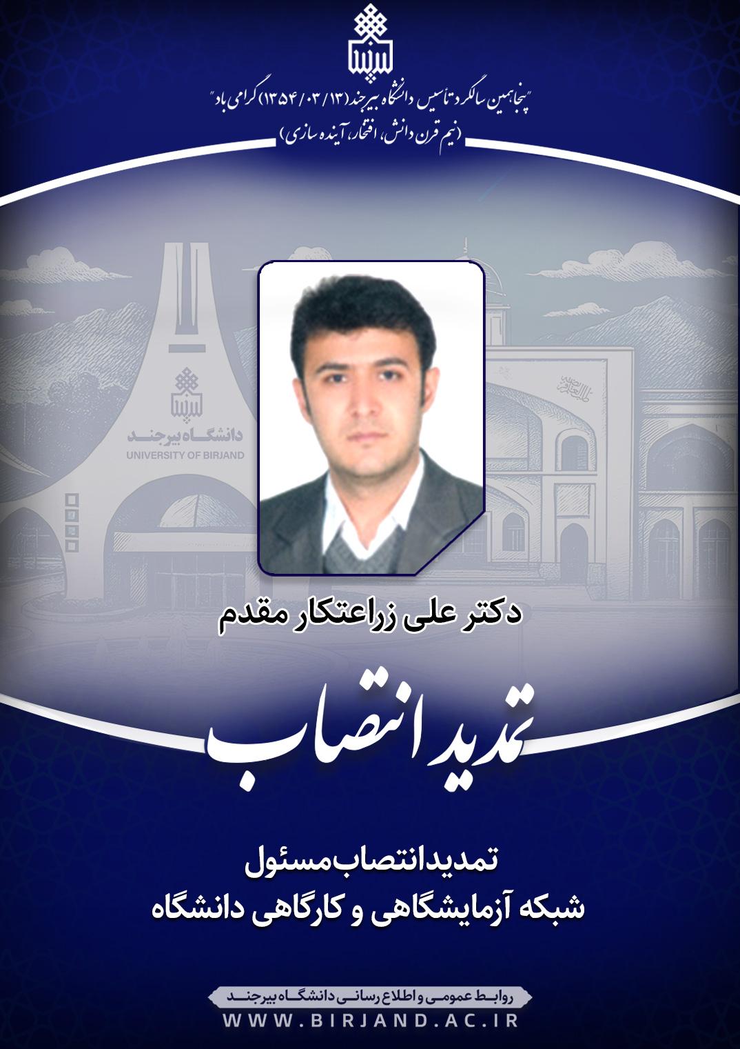 به گزارش روابط عمومی و اطلاع‌رسانی دانشگاه بیرجند، در ابلاغ تمدید انتصاب صادره از سوی دکتر  خامسان به دکتر زراعتکارمقدم آمده است؛ نظر به مراتب تعهد، تجارب و شایسـتگی‌های علمی و اجرایی جناب‌عالی و با تشکر از اقدامات و تلاش‌های مستمر، مثمرثمر و ارزشمند شما، به موجب این ابلاغ و با حفظ سمت آموزشی و پژوهشی، انتصاب شما به سمت مسـئول شبکه آزمایشگاهی و کارگاهی دانشگاه به مدت دو سال تمدید می‌شود. اطمینـان دارم بـا اتکال به خداوند سـبحان و بهره‌گیری از مشارکت و همفکری همکاران دانشـگاهی، منشاء خـدمات ارزنـده‌ای در این حوزه خواهید بود.