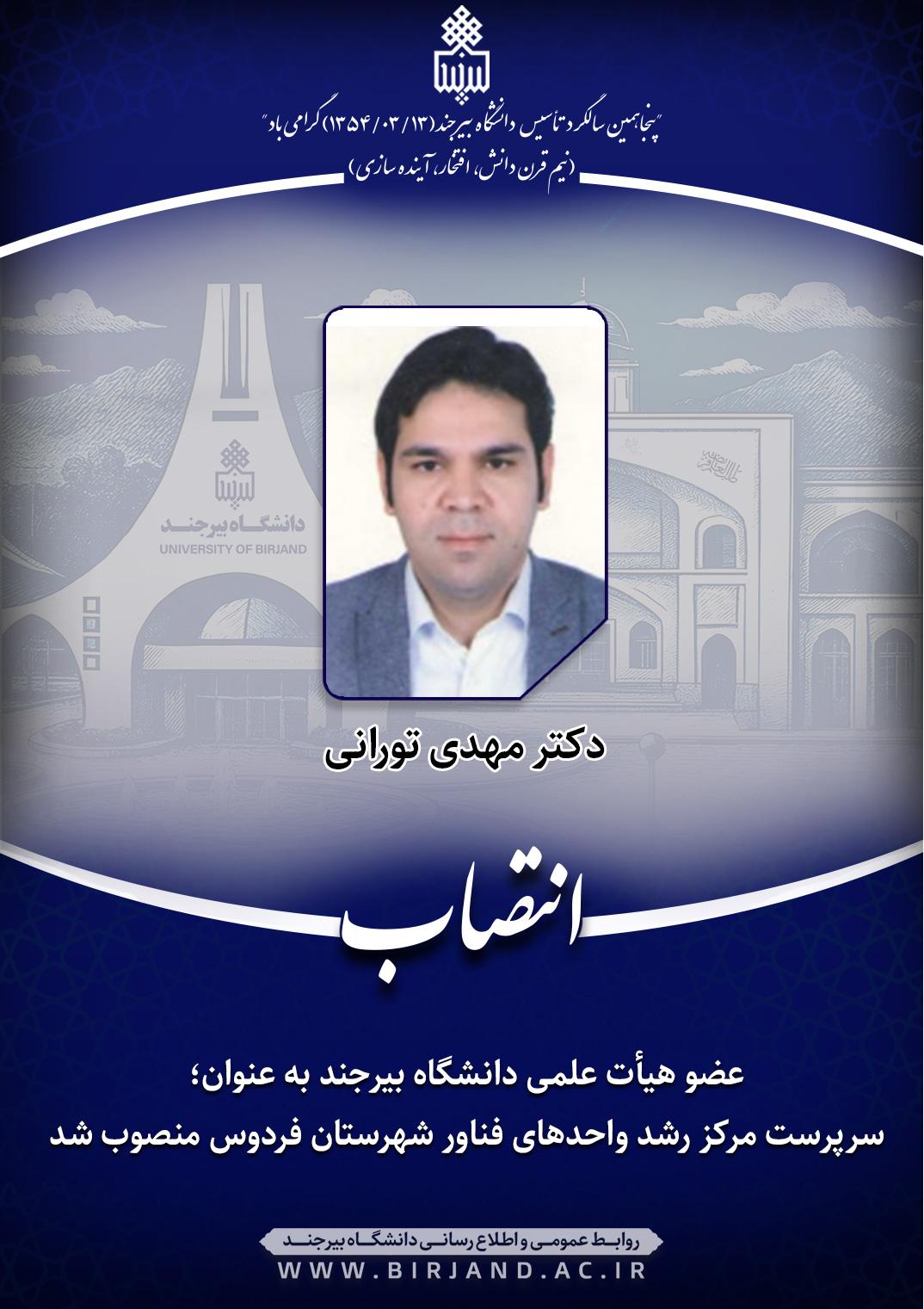 به گزارش روابط عمومی و اطلاعرسانی دانشگاه بیرجند، در ابلاغ انتصاب دکتر تورانی آمده است؛ با عنایت به تعهد تخصصی، علمی و اجرایی ارزشمند جنابعالی و بنا به پیشنهاد مدیر محترم پارک علم و فناوری، به موجب این حکم به عنوان سرپرست مرکز رشد واحدهای فناور شهرستان فردوس منصوب میشوید.امید است با اتکال به خداوند متعال ضمن برخورداری از خرد جمعی، جلب مشارکت اعضای محترم هیأت علمی و شرکتهای دانش بنیان، با برنامهریزی و نظارت دقیق بر امورات محوله در جهت توسعه هرچه بیشتر آن مرکز موفق باشید.