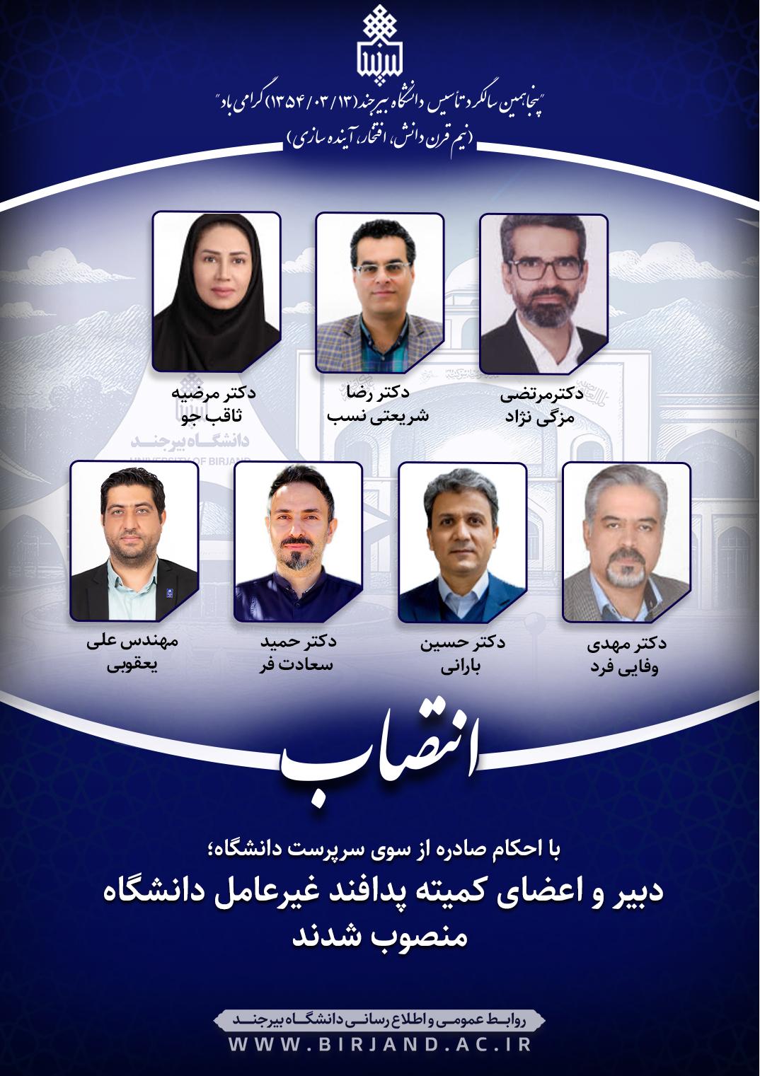 به گزارش روابط عمومی و اطلاع‌رسانی دانشگاه بیرجند، براساس احکام صادره از سوی سرپرست دانشگاه، دکتر مرتضی مزگی‌نژاد، به عنوان دبیر و دکتر رضا شریعتی نسب، معاون اداری و مالی، دکتر مهدی وفائی‌فرد، سرپرست معاونت فرهنگی و اجتماعی،دکتر مرضیه ثاقب جو، سرپرست معاونت پژوهش، فناوری و نوآوری و دکتر حسین بارانی، معاون دانشجویی، دکتر حمید سعادت فر، مدیر توسعه فناوری اطلاعات، امنیت و هوشمندسازی و مهندس علی یعقوبی، مدیر امور فنی و نظارت بر طرح های عمرانی  به مدت دوسال به عنوان اعضای کمیته پدافند غیرعامل دانشگاه منصوب شدند.