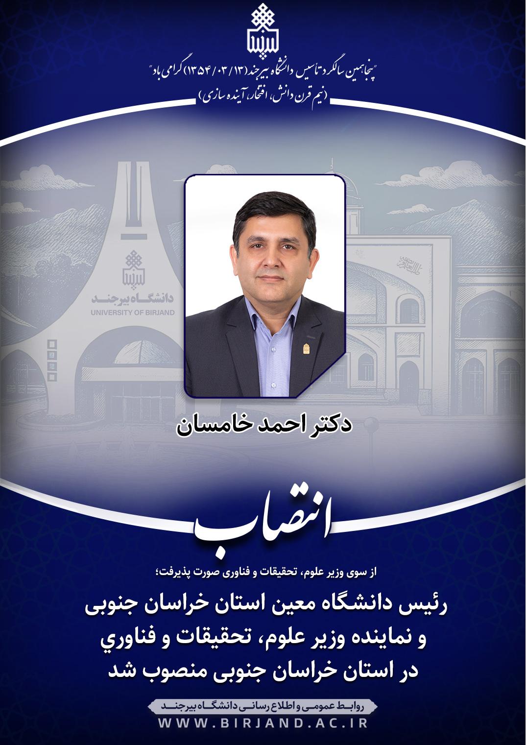 براساس حکمی از سوی دکتر حسین سیمایی، وزیر علوم، تحقیقات و فناوری، دکتر احمد خامسان، سرپرست دانشگاه بیرجند به سمت رئیس دانشگاه معین استان و نماینـده وزیر علوم، تحقیقـات و فنـاوری دراسـتان خراسان جنوبی منصوب شد.