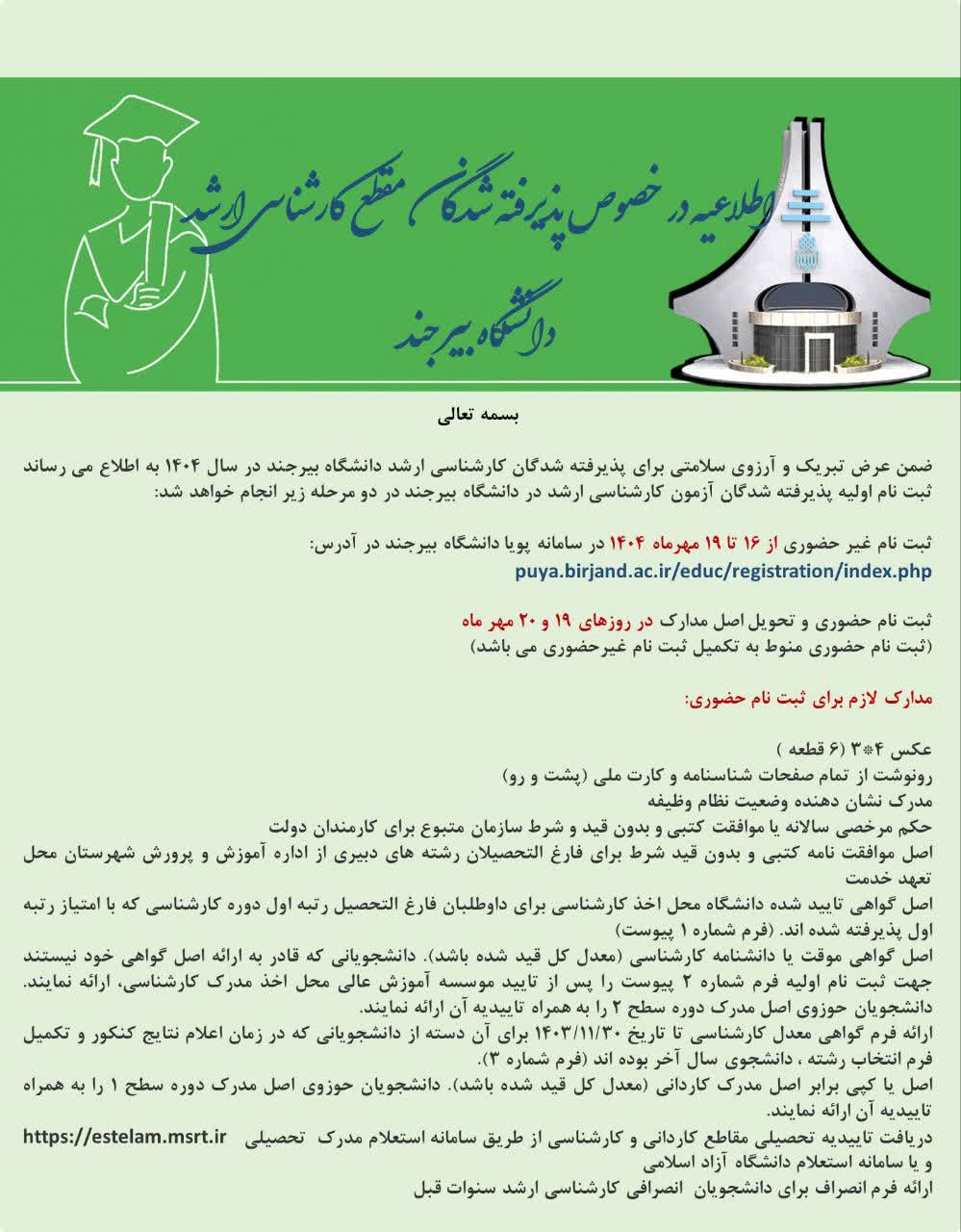 اطلاعیه در خصوص پذیرفته شدگان مقطع کارشناسی ارشد دانشگاه بیرجند