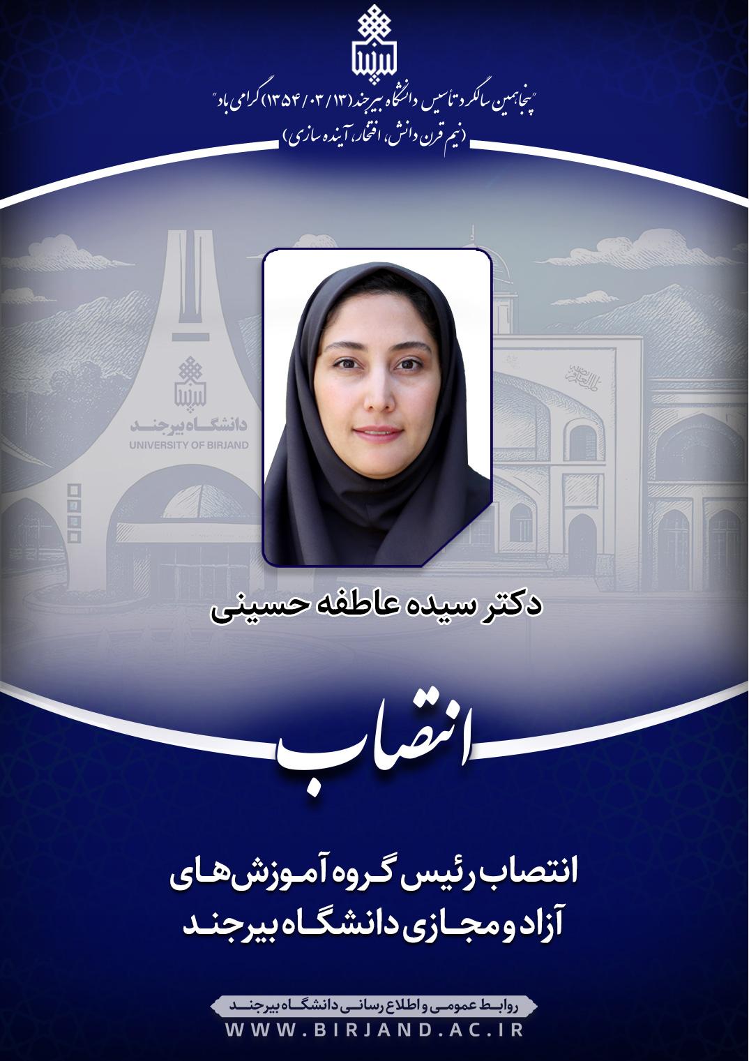 به گزارش روابط عمومی و اطلاع‌رسانی دانشگاه بیرجند، در متن ابلاغ انتصاب دکتر سیده عاطفه حسینی به سمت رئیس گروه آموزش‌های آزاد و مجازی دانشگاه بیرجند آمده است؛ نظر به مراتب تعهـد، تجارب و شایسـتگی‌های علمی و اجرایی سرکارعالی، به موجب این ابلاغ و با حفظ سمت آموزشی و پژوهشـی، به مـدت دو سال به عنوان رئیس گروه آموزش‌هـای آزاد و مجـازی دانشـگاه منصوب می‌شویـد. اطمینـان دارم بـا اتکال به خداوند سبحان و بهره‌گیری از مشـارکت و همفکری همکاران دانشگاهی، منشاء خدمات ارزنده‌ای خواهید بود.