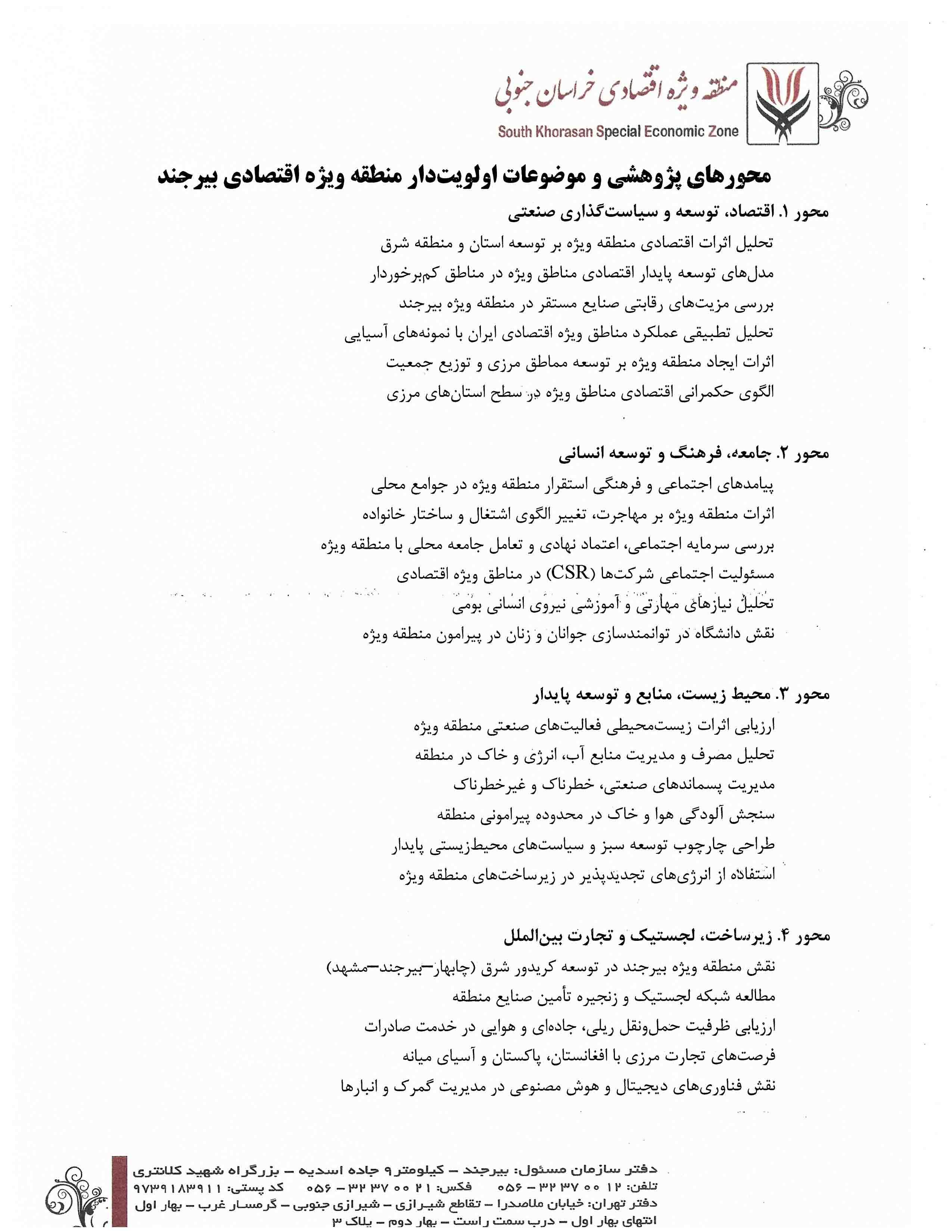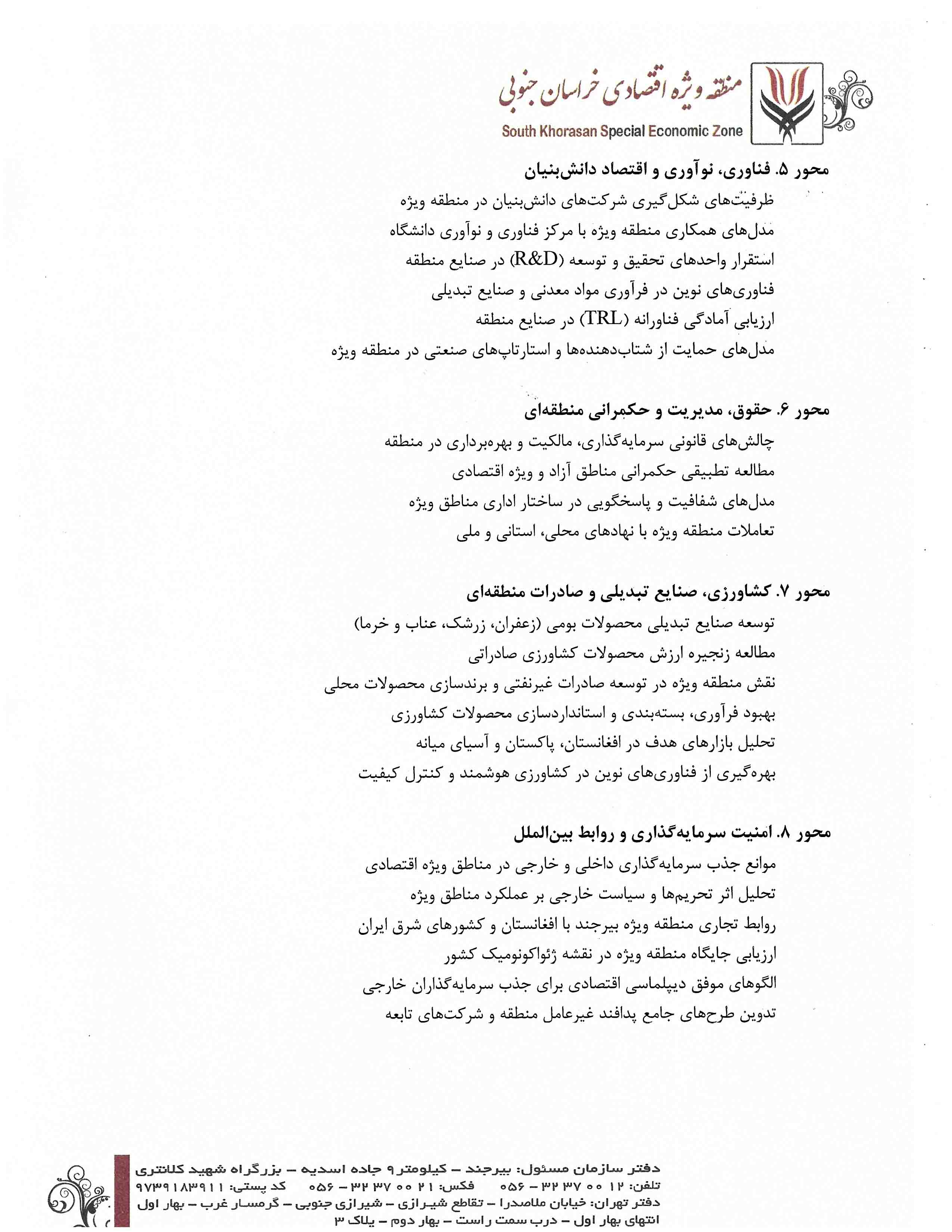 محورهای پژوهشی و طرح‌های اولویت دار منطقه ویژه اقتصادی بیرجند