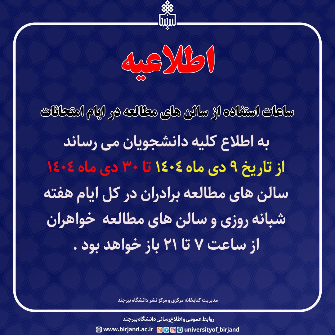با توجه به فرا رسیدن ایام امتحانات، سالن‌های مطالعه کتابخانه مرکزی از تاریخ ۹ دی ماه ۱۴۰۴ تا ۳۰ دی ماه ۱۴۰۴ به صورت زیر فعال خواهند بود: