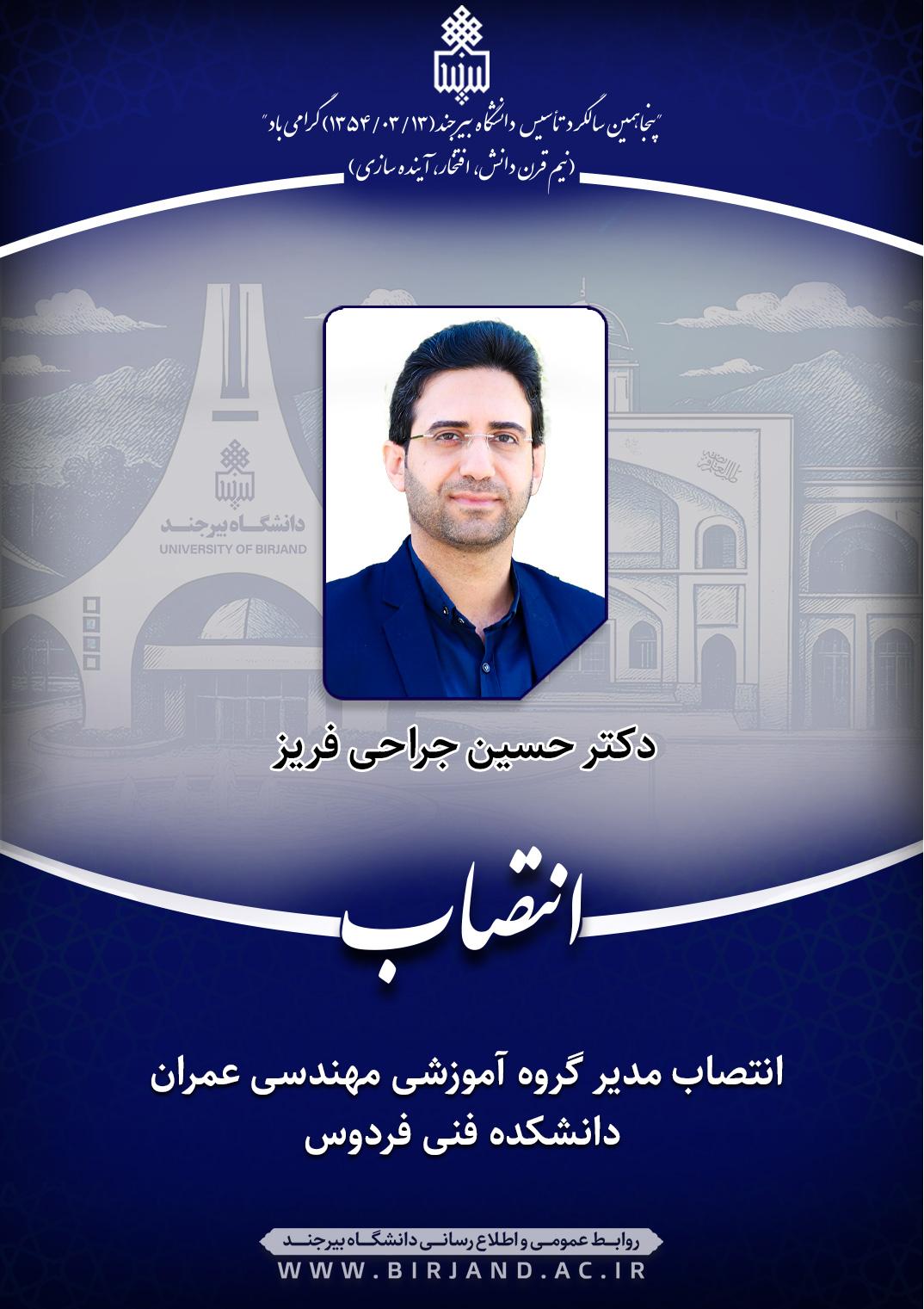 طی ابلاغی از سوی دکتر احمد خامسان، سرپرست دانشگاه بیرجند، دکتر حسین جراحی فریز، عضو هیأت علمی گروه مهندسی عمران فردوس، با حفظ سمت آموزشی و پژوهشی، به مدت دو سال به عنوان مدیر گروه آموزشی مهندسی عمران دانشکده فنی فردوس منصوب شد.