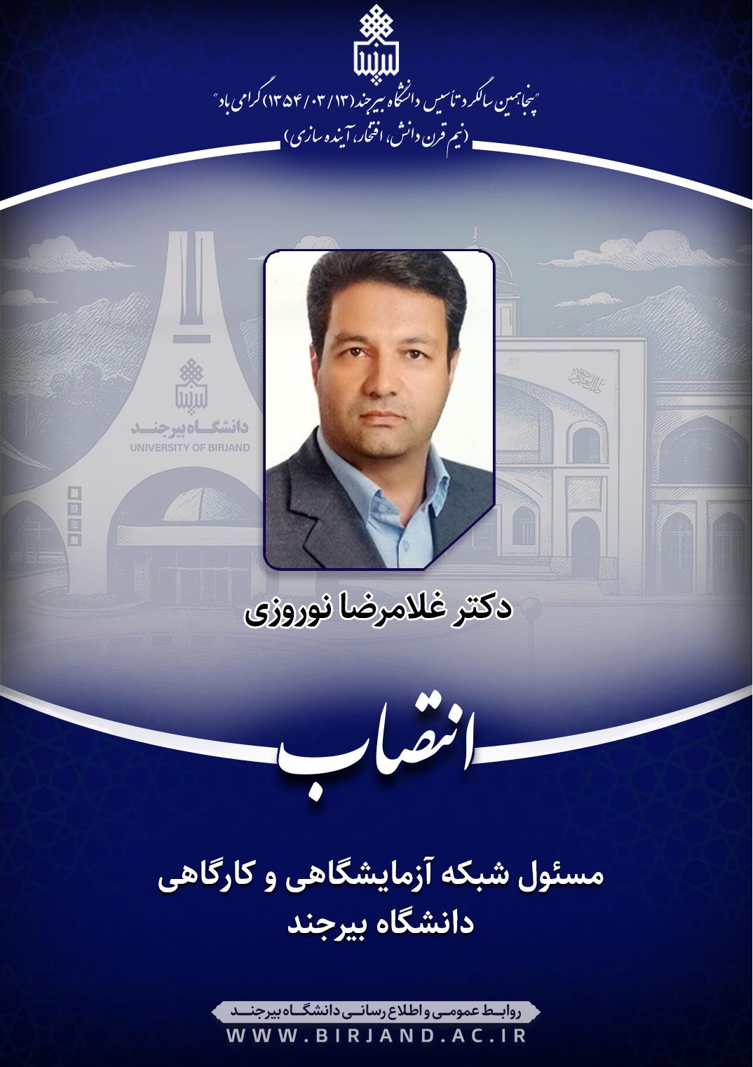 دکتر احمد خامسان، سرپرست دانشگاه بیرجند، طی ابلاغی، دکتر غلامرضا نوروزی، عضو هیأت علمی گروه آموزشی مهندسی معدن را به سمت مسئول شبکه آزمایشگاهی و کارگاهی دانشگاه به مدت دو سال منصوب کرد.