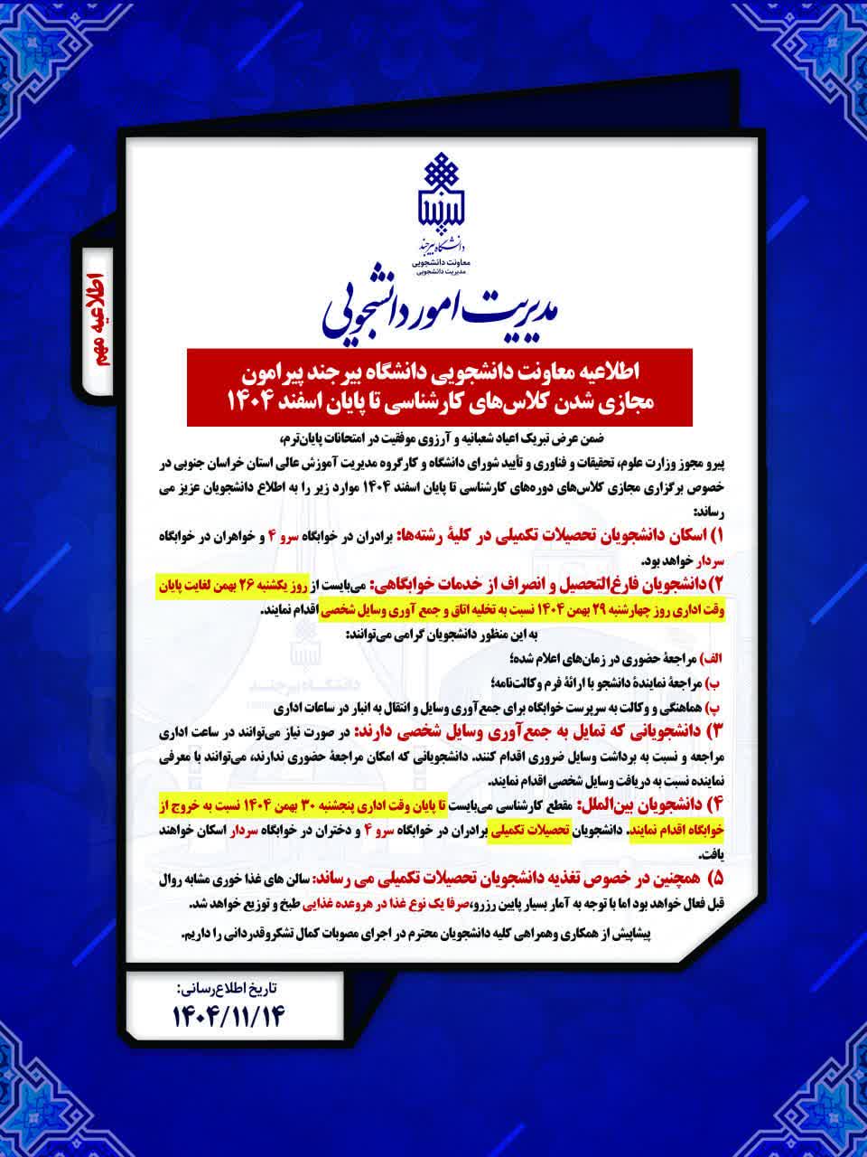 اطلاعیه معاونت دانشجویی دانشگاه بیرجند پیرامون مجازی شدن کلاس‌های کارشناسی تا پایان اسفند 1404(اسکان و تغذیه)